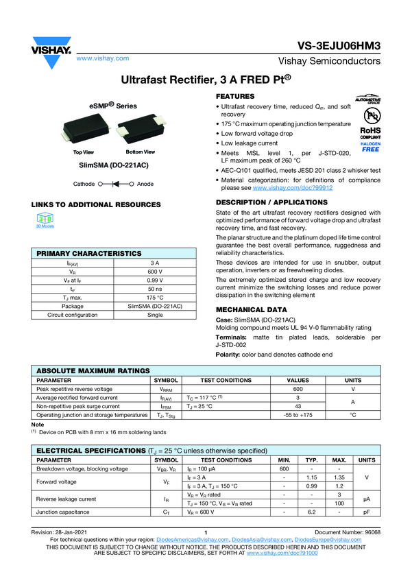 VS-3EJU06HM3 Ultrafast Rectifier, 3 A FRED Pt®
