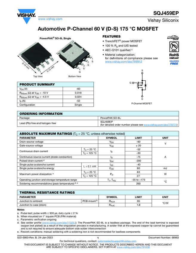 SQJ459EP Automotive P-Channel 60 V (D-S) 175 °C MOSFET
