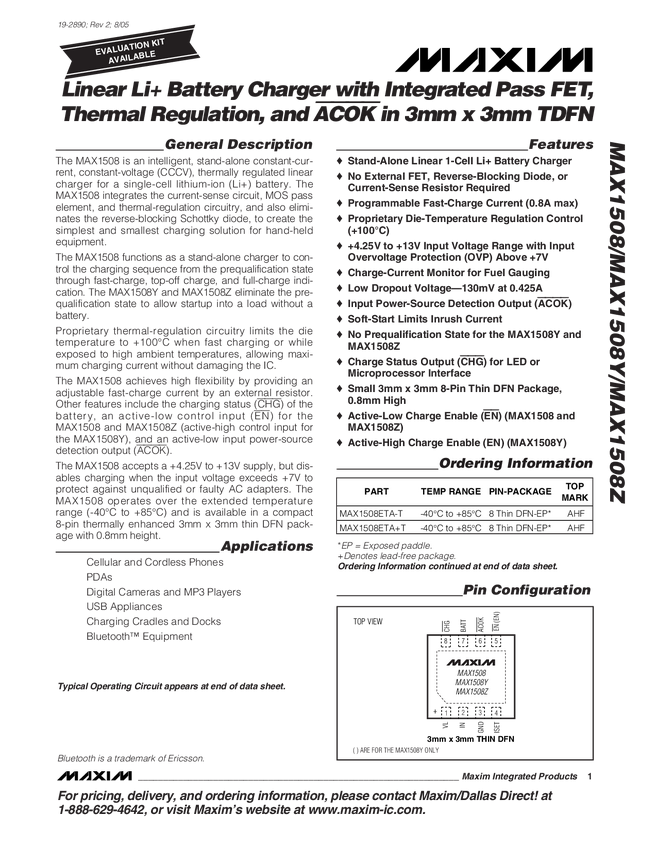 MAX1508Z Linear Li+ Battery Charger with Integrated Pass FET, Thermal Regulation, an...