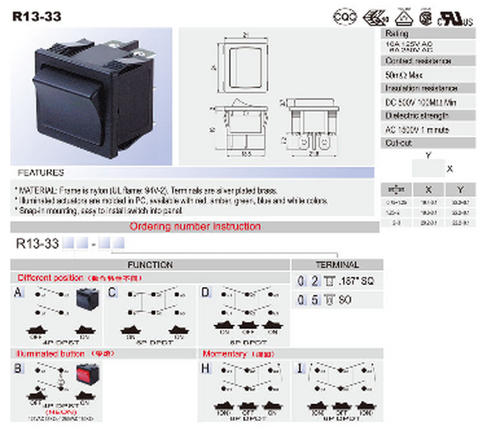 Przełącznik; klawiszowy; ROCKER; DPST; Pozycje: 2; OFF-ON; 6A/250VAC; czarny; brak; 50mR; R13-33A-02-BB-2D; SCI; RoHS