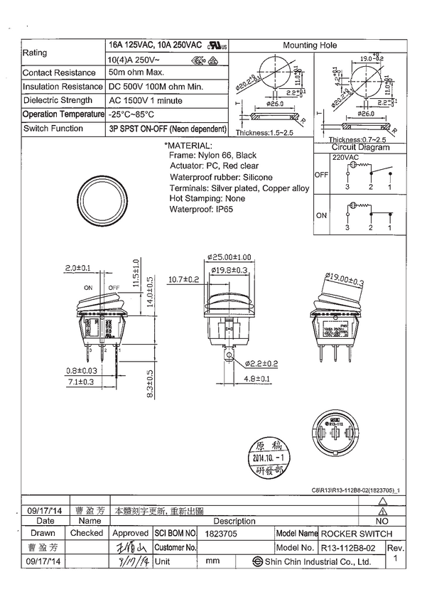 Przełącznik; R13-112B8W-02-BRNN-0A-N2; ROCKER; ON-OFF; 10A; 250V AC; czerwony; IP65; 2 pozycje; konektor 4,8mm; fi 20,2mm; SCI; RoHS