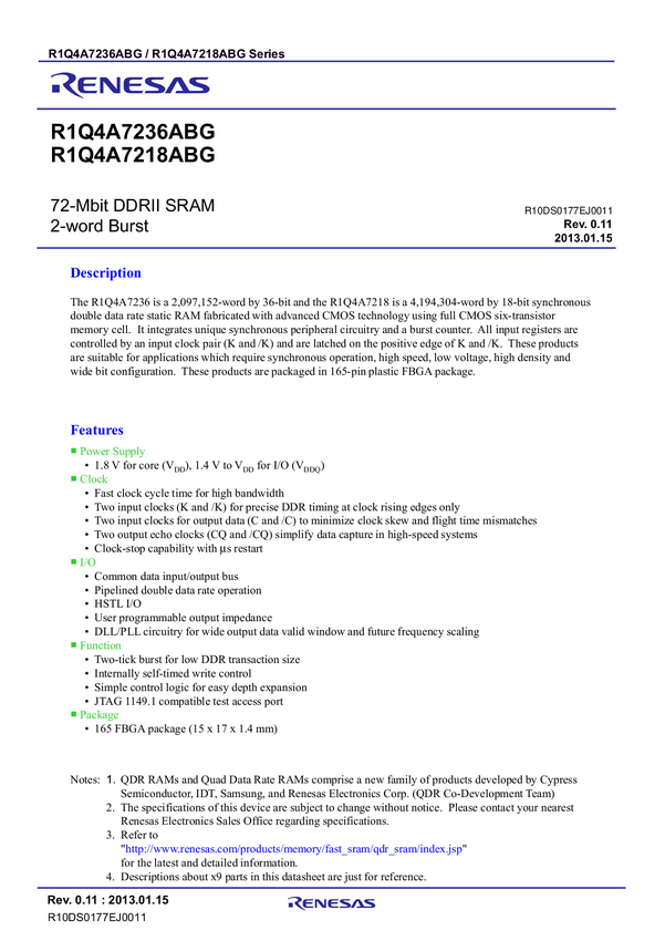 R1Q4A7236ABG-33I QDRII/DDRII/ QDRII+/DDRII+ SRAM