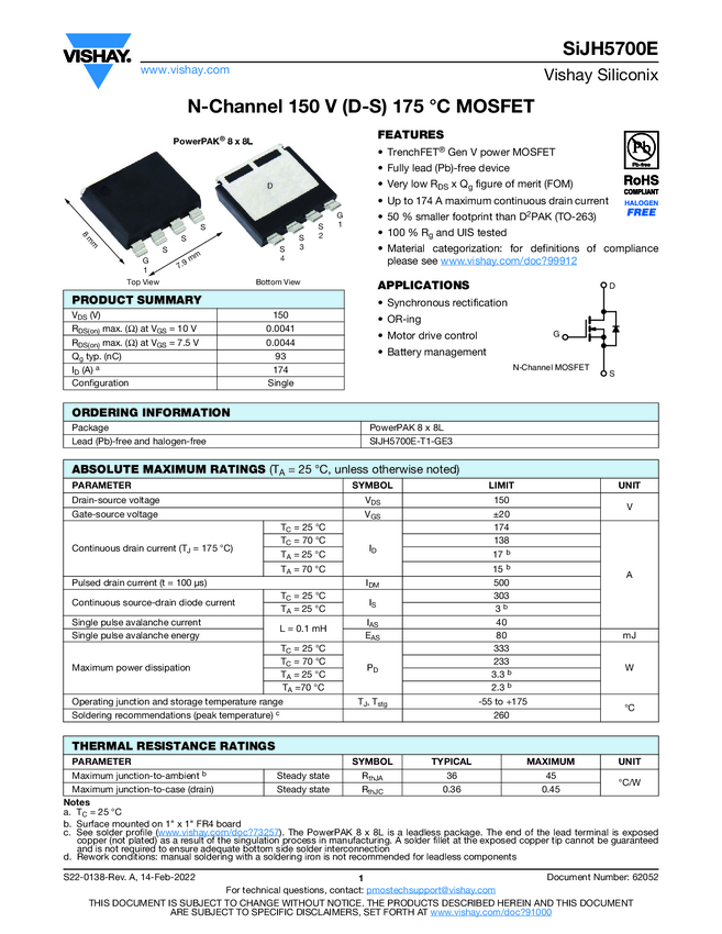 SiJH5700E N-Channel 150 V (D-S) 175 °C MOSFET