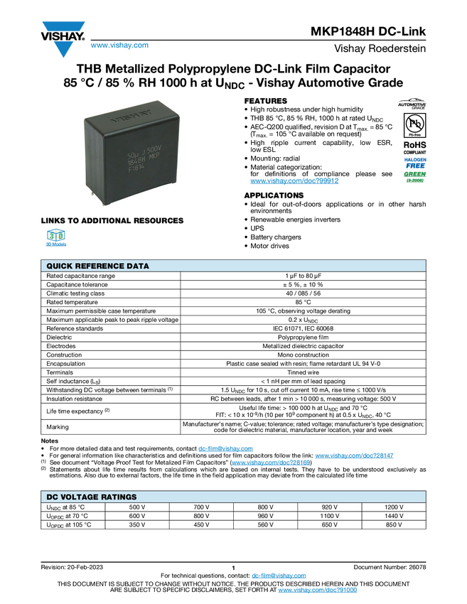 THB Metallized Polypropylene DC-Link Film Capacitor 85 °C / 85 % RH 1000 h at UNDC - Vishay Automotive Grade