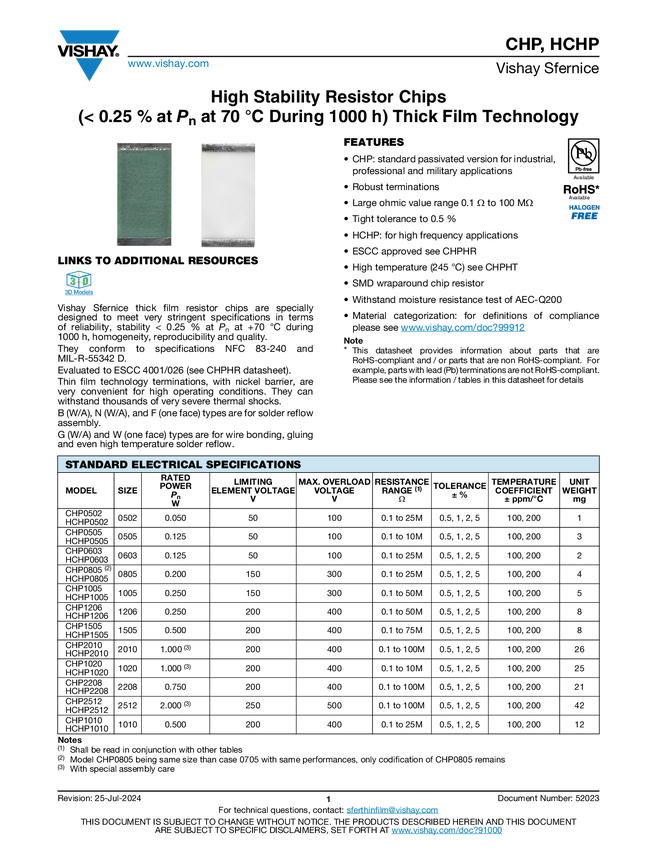 HCHP High Stability Resistor Chips (< 0.25 % at Pn at 70 °C During 1000...