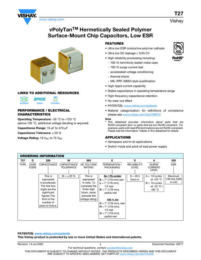 T27 vPolyTan™ Hermetically Sealed Polymer Surface-Mount Chip Capacitors,...