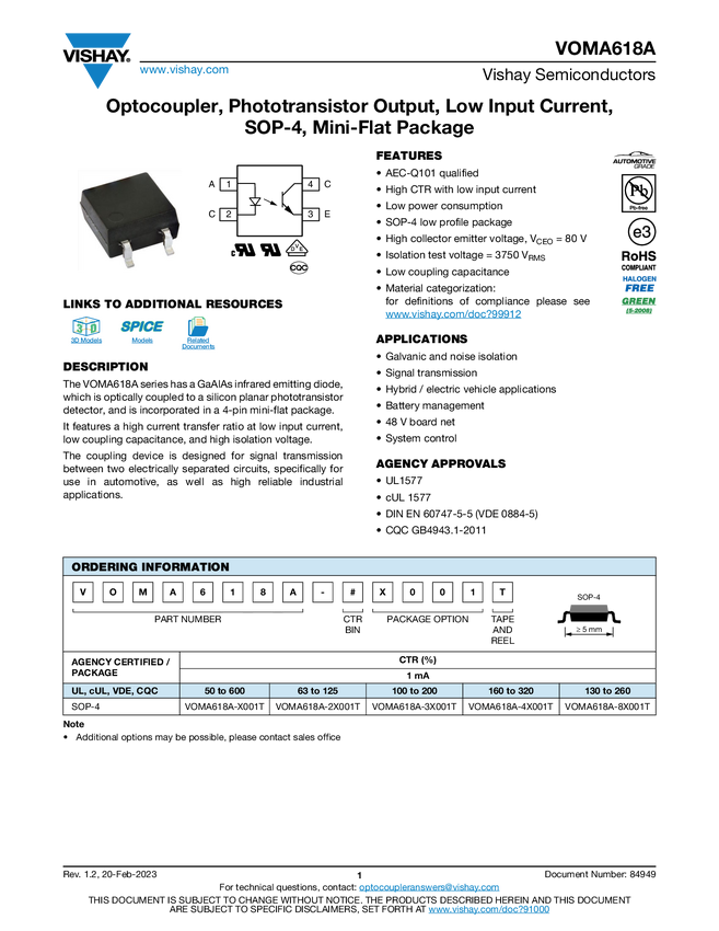 VOMA618A Optocoupler, Phototransistor Output, Low Input Current, SOP-4, Mini-Flat Pa...