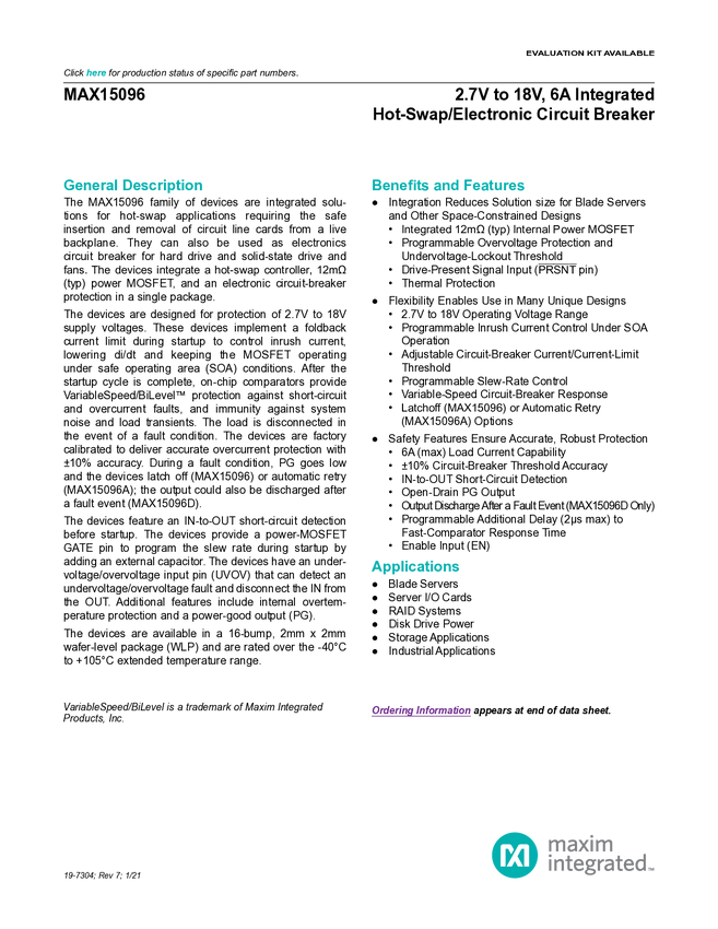 MAX15096D 2.7V to 18V, 6A Integrated Hot-Swap/Electronic Circuit Breaker