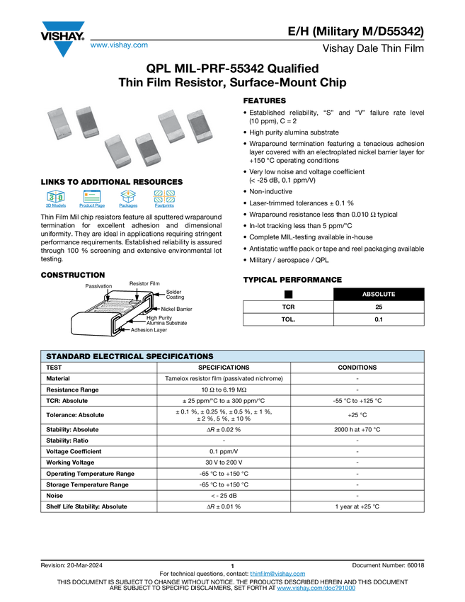 QPL MIL-PRF-55342 Qualified Thin Film Resistor, Surface-Mount Chip