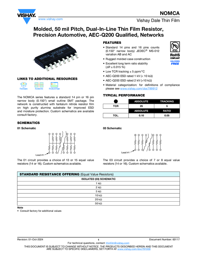 NOMCA Molded, 50 mil Pitch, Dual-In-Line Thin Film Resistor, Narrow Body, Surface...