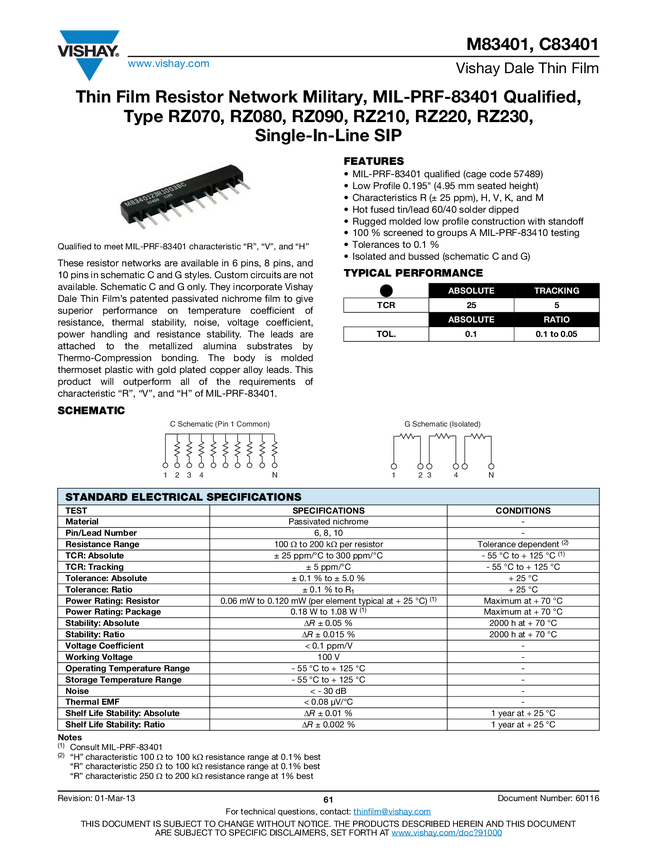 Thin Film Resistor Network Military, MIL-PRF-83401 Qualified, Type RZ070, RZ080, RZ090, RZ220, RZ221, RZ223, Single-In-Line SIP