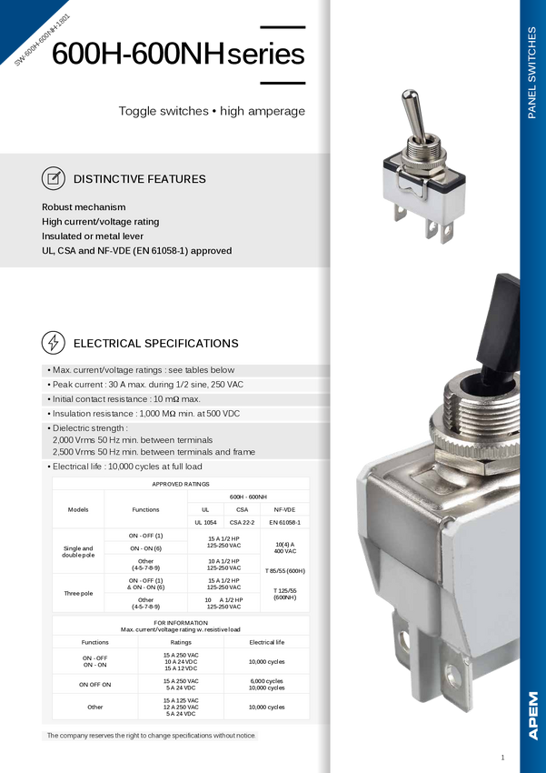 Przełącznik: dźwigniowy; 636H; ON-ON; 1 tor; 3 pin; śruba; 15A; 250VAC; fi 12,2mm; Pozycje: 2; SPDT; APEM; RoHS