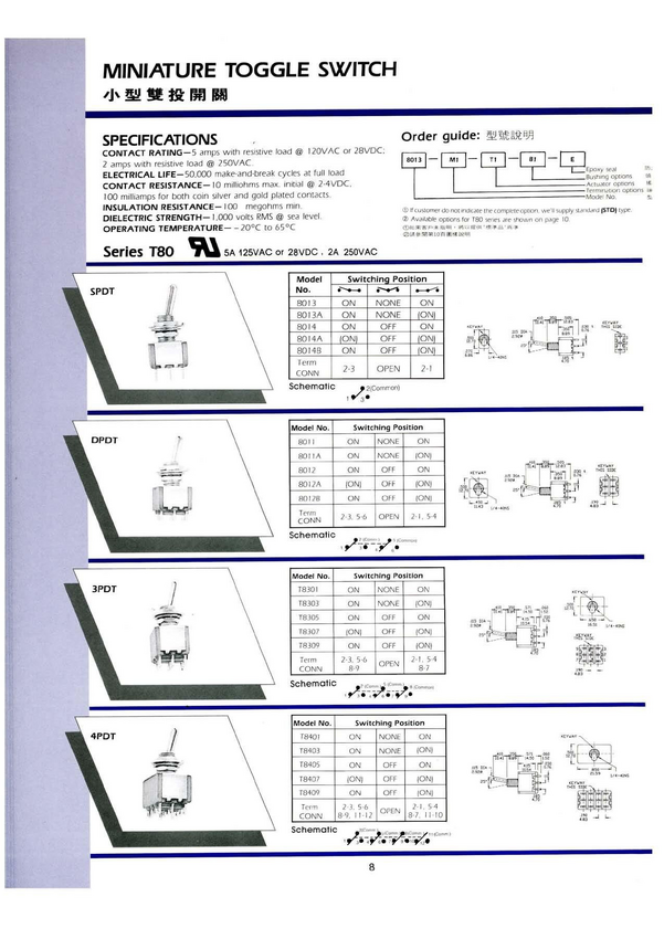 16060 Przełącznik; dźwigniowy; T80-8011-T1-B1-M2; 2*2; ON-ON; 2 tory; 2 pozycje;...