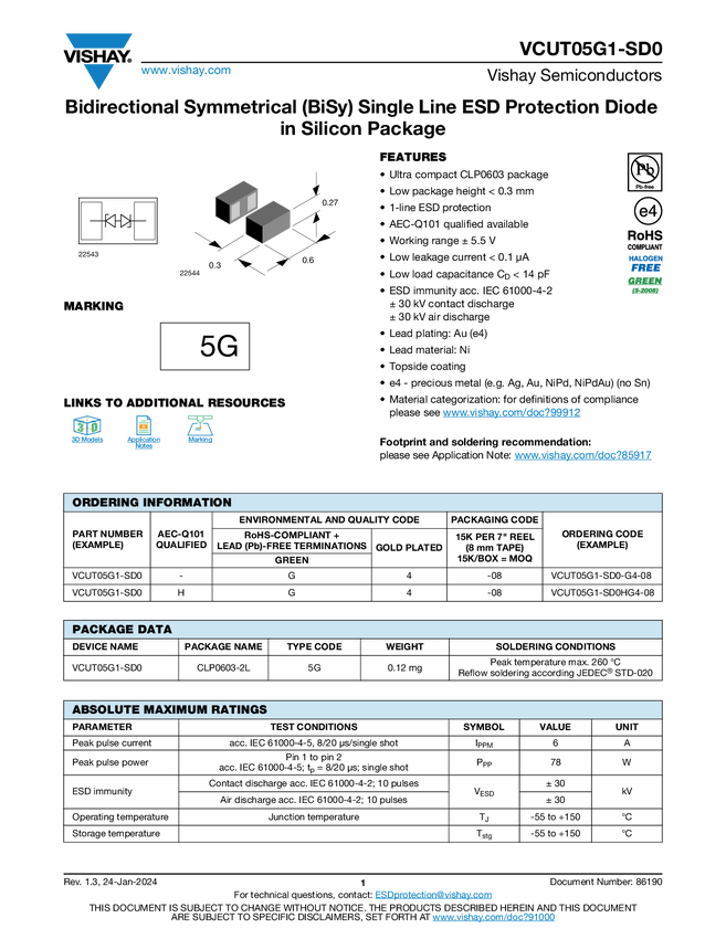 VCUT05G1-SD0 Bidirectional Symmetrical (BiSy) Single Line ESD Protection Diode in Silico...