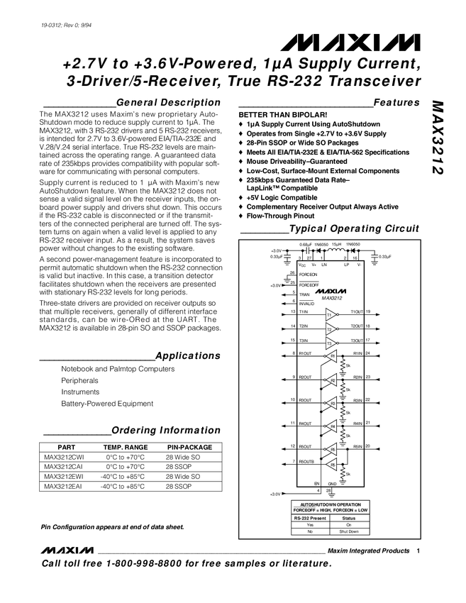 MAX3212 +2.7V to +3.6V Powered, 1µA Supply Current, 3-Driver/5-Receiver, True RS-23...