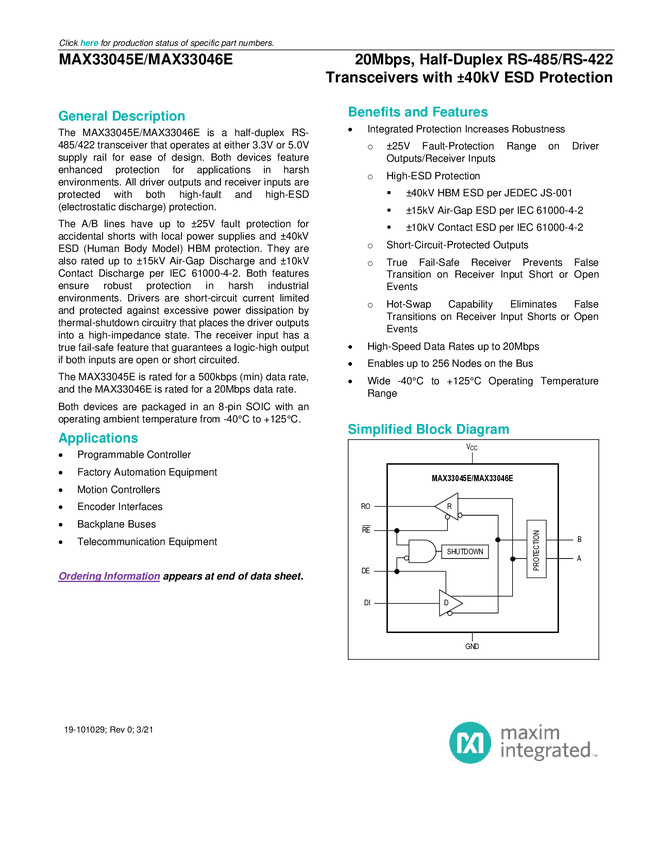 MAX33045E 20Mbps, Half-Duplex RS-485/RS-422 Transceivers with ±40kV ESD Protection