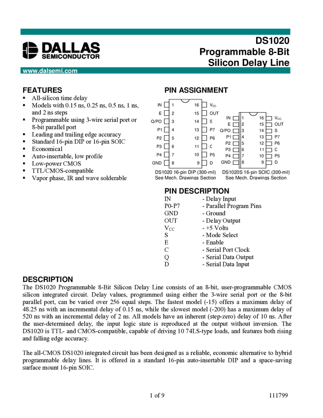 DS1020-100 Programmable 8 bit Silicon Delay Line