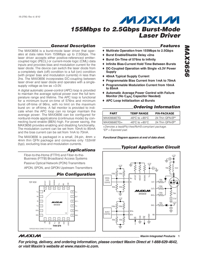 MAX3656 155Mbps to 2.5Gbps Burst-Mode Laser Driver