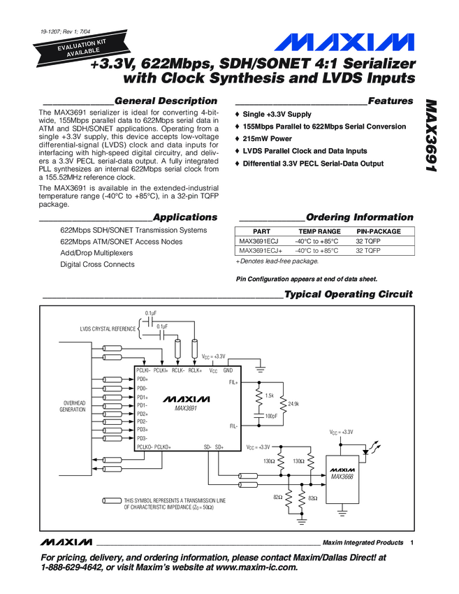 MAX3691 +3.3V, 622Mbps, SDH/SONET 4:1 Serializer with Clock Synthesis and LVDS Inpu...