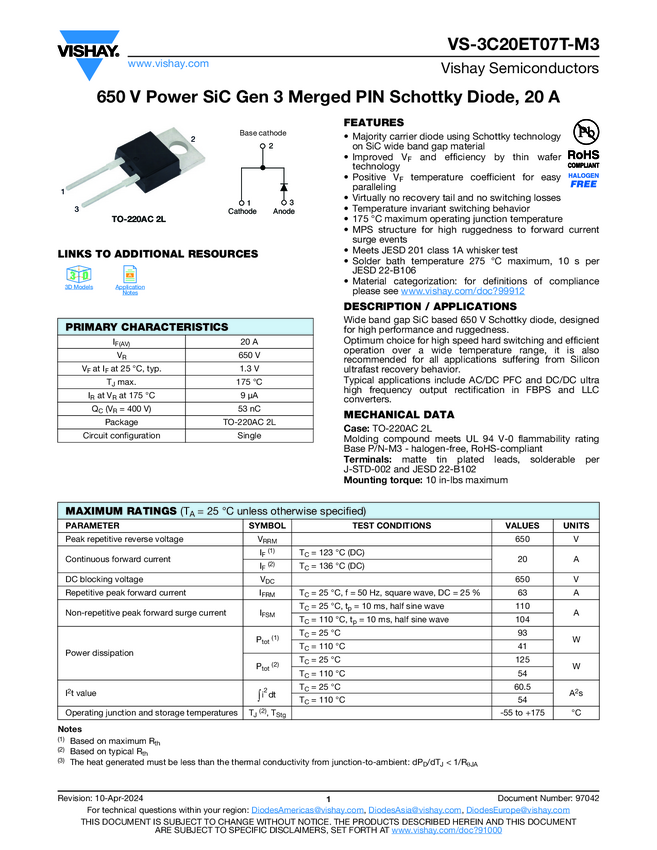 VS-3C20ET07T-M3 650 V Power SiC Merged PIN Schottky Diode, 20 A
