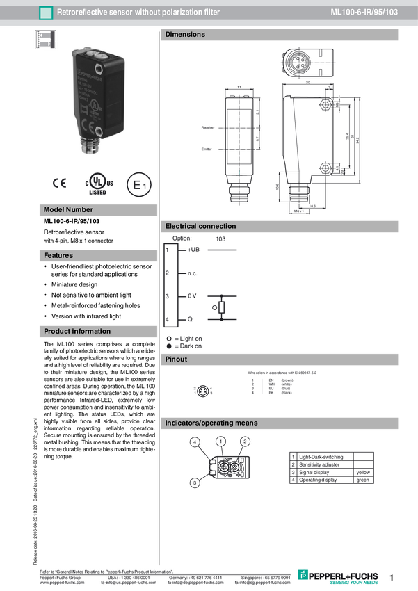 226772 Czujnik fotoelektryczny Pepperl+Fuchs ML100-6-IR/95/103 226772 1...