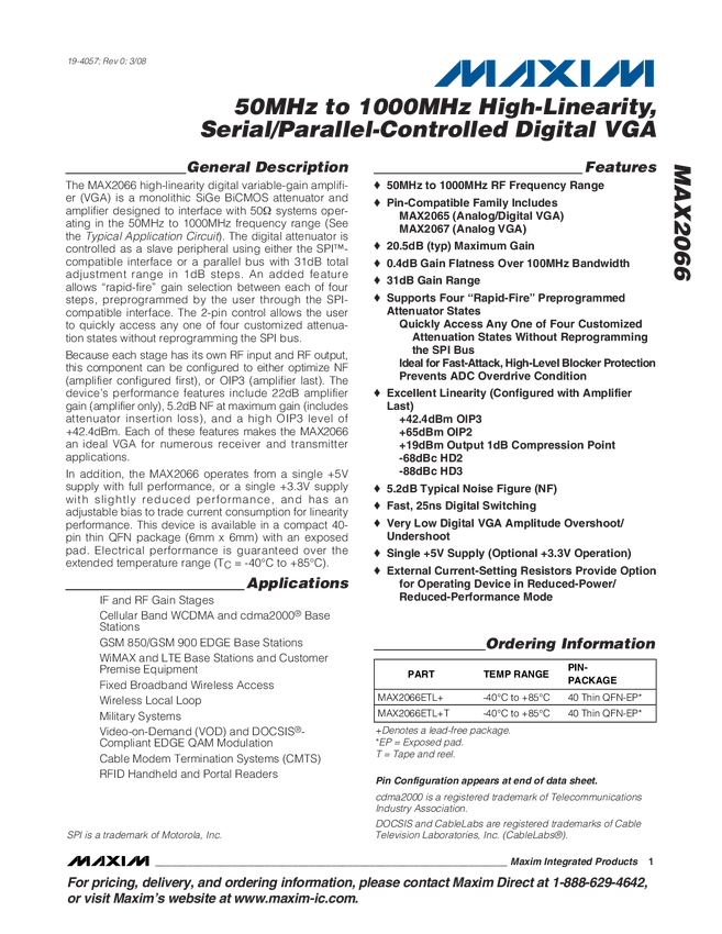 MAX2066 50MHz to 1000MHz High-Linearity, Serial/Parallel-Controlled Digital VGA