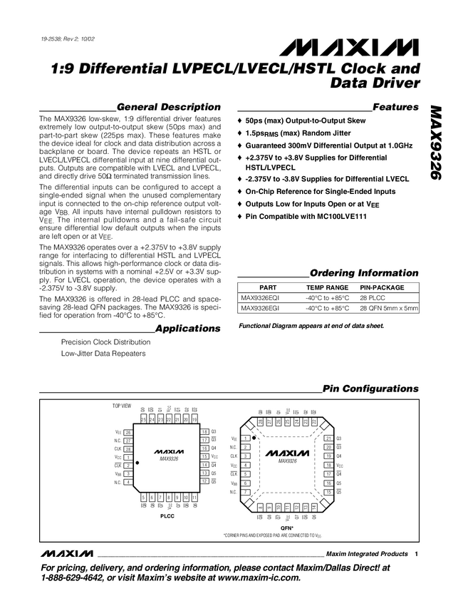 MAX9326 1:9 Differential LVPECL/LVECL/HSTL Clock and Data Driver