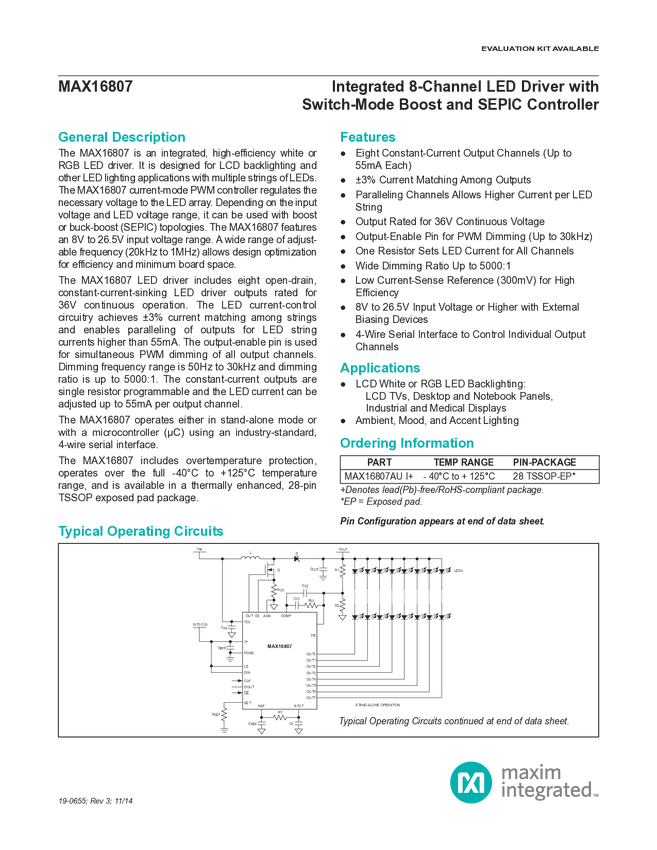 MAX16807 Integrated 8-Channel LED Driver with Switch-Mode Boost and SEPIC Controller
