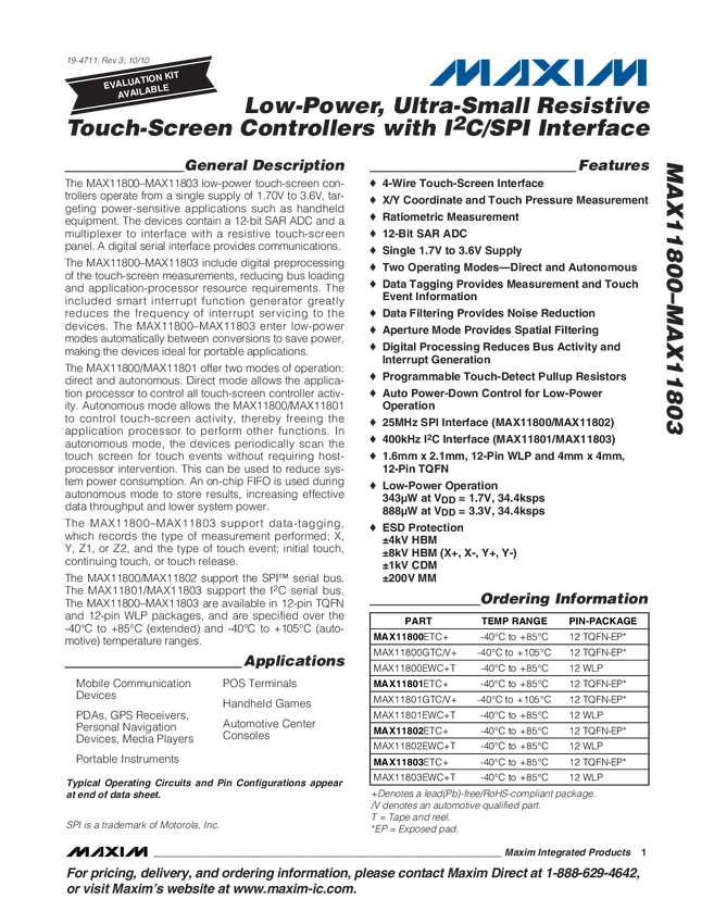 MAX11800 Low-Power, Ultra-Small Resistive Touch-Screen Controllers with I²C/SPI Inte...