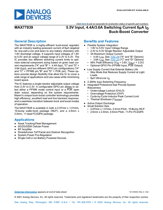 MAX77839 5.5V Input, 4.4A/3.6A Switching Current 6μA I Buck-Boost Converter