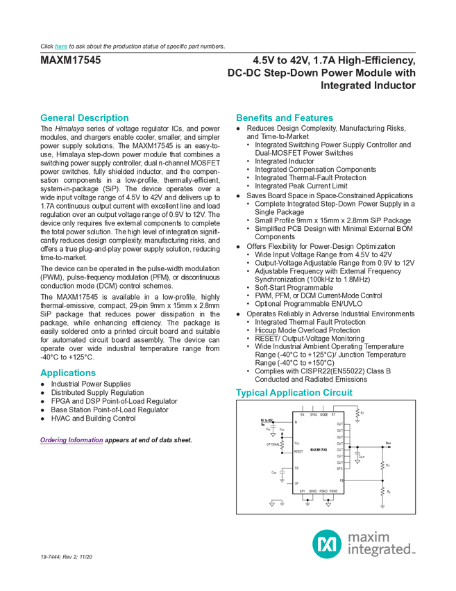 MAXM17545 4.5V to 42V, 1.7A High-Efficiency, DC-DC Step-Down Power Module with Integr...