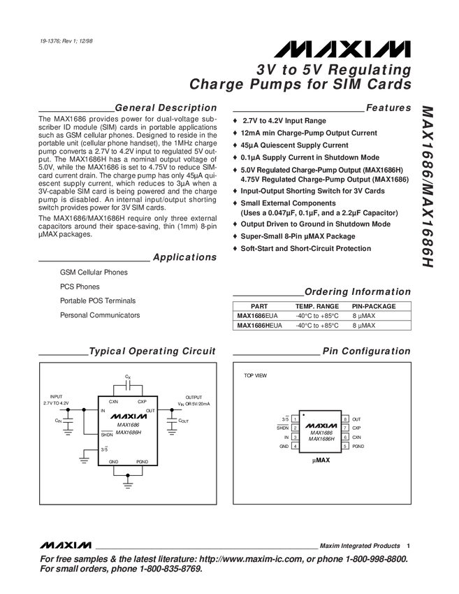 MAX1686H 3V to 5V Regulating Charge Pumps for SIM Cards