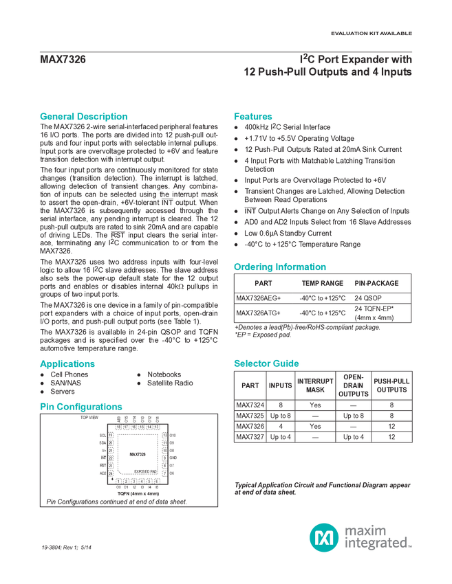 MAX7326 I²C Port Expander with 12 Push-Pull Outputs and Four Inputs