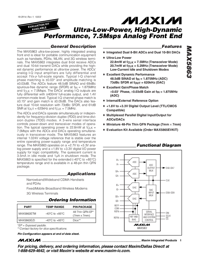 MAX5863 Ultra-Low-Power, High-Dynamic Performance, 7.5Msps Analog Front End