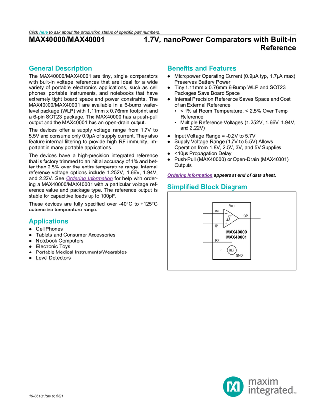 MAX40001 1.7V, nanoPower Comparators with Built-In Reference