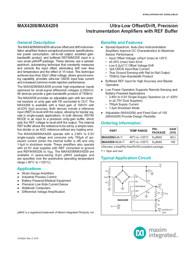 MAX4208 Ultra-Low Offset/Drift, Precision Instrumentation Amplifiers with REF Buffe...