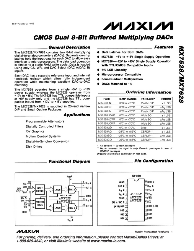 MX7628 CMOS, Dual, Buffered, 8-Bit Multiplying DAC