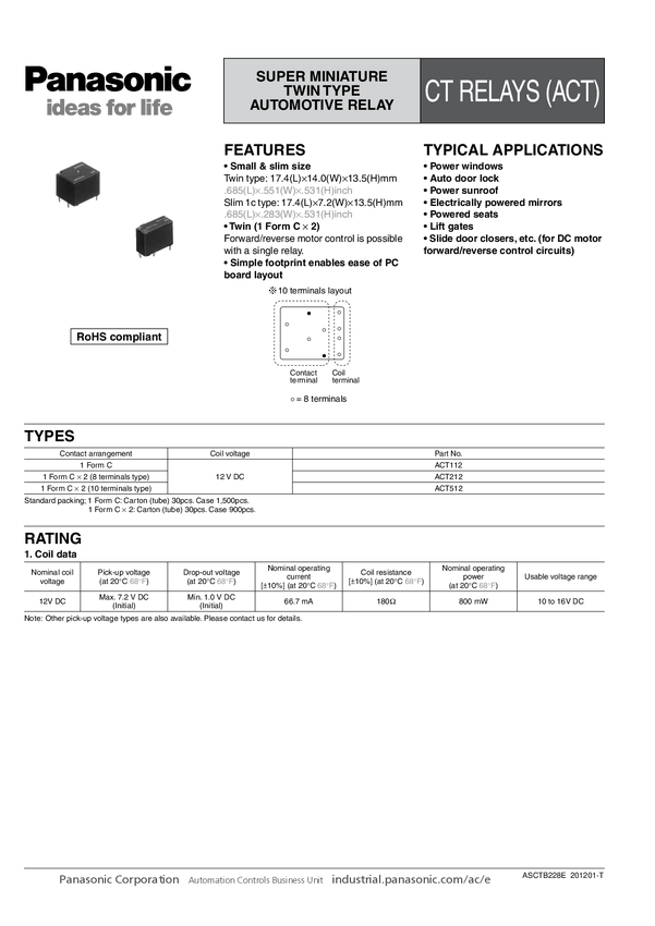 Przekaźnik; ACT512; elektromagnetyczny; 12V DC; 35A (max.2min.); 25A; 180R; 800mW; 10-16VDC; 2xSPDT 2x 1 styk przełączny; NAIS; RoHS