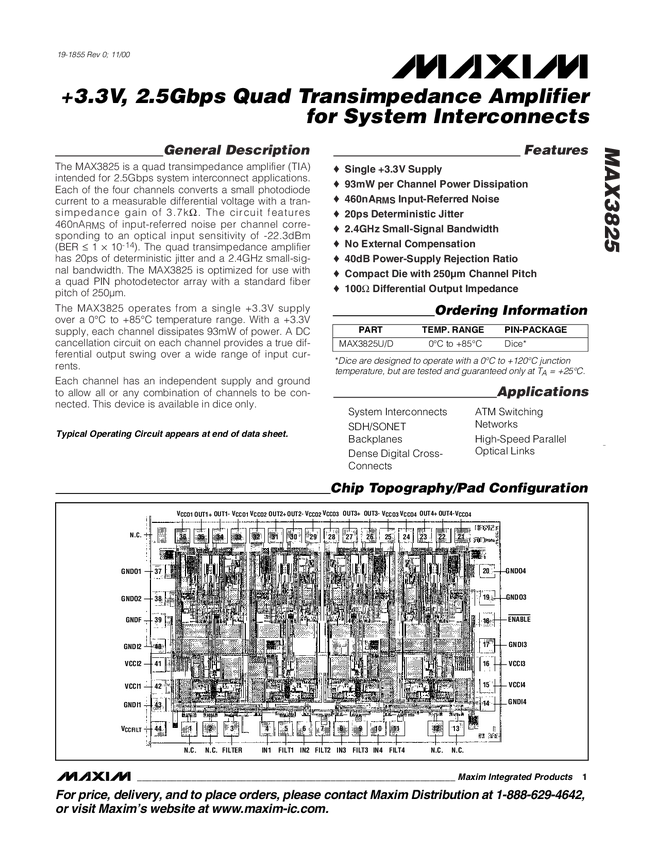 MAX3825 +3.3V, 2.5Gbps, Quad, Transimpedance Amplifier for System Interconnects