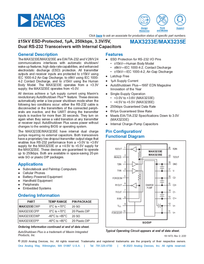 MAX3235E ±15kV ESD-Protected, 1µA, 250kbps, 3.3V/5V, Dual RS-232 Transceivers with I...