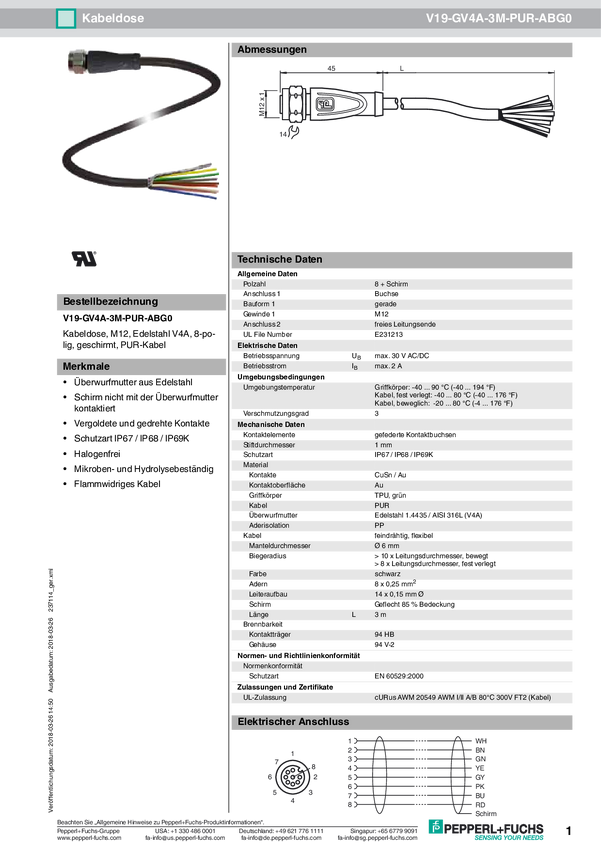 Pepperl+Fuchs 237114 Gniazdo kablowe V19-GV4A-3M-PUR-ABG0, piny: 8, 3.00 m, 1 szt.