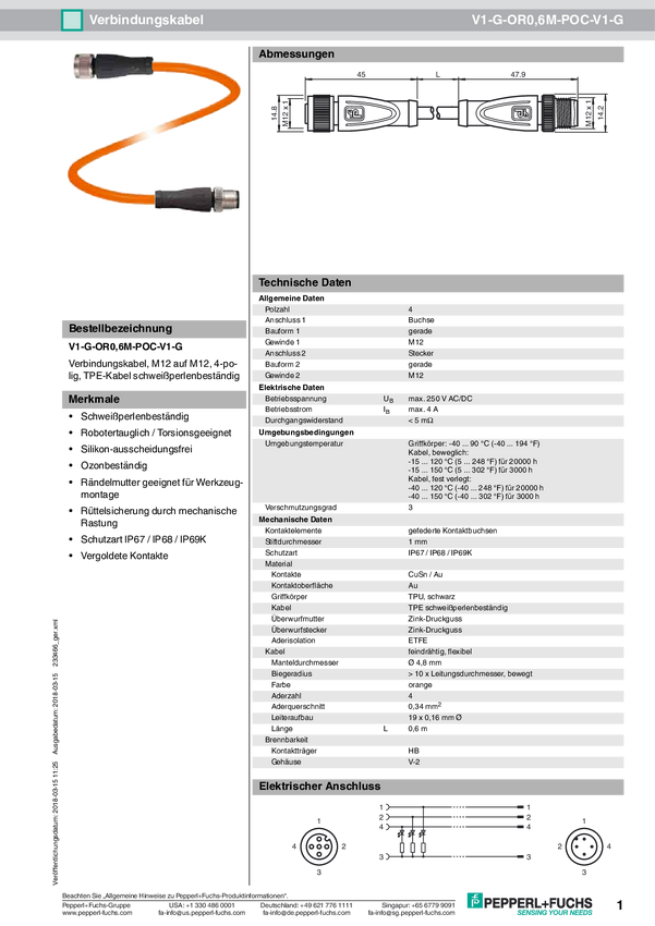 Pepperl+Fuchs 233466 Złącze czujnika/aktuatora V1-G-OR0,6M-POC-V1-G, piny: 4, 0.60 m, 1 szt.