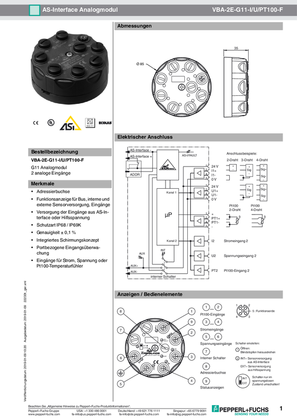 Rozdzielacz czujnik / element wykonawczy, aktywny Pepperl+Fuchs VBA-2E-G11-I/U/PT100-F 222331 1 szt.