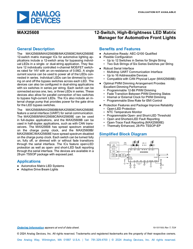 MAX25608 12-Switch, High Brightness LED Matrix Manager for Automotive Front Lights