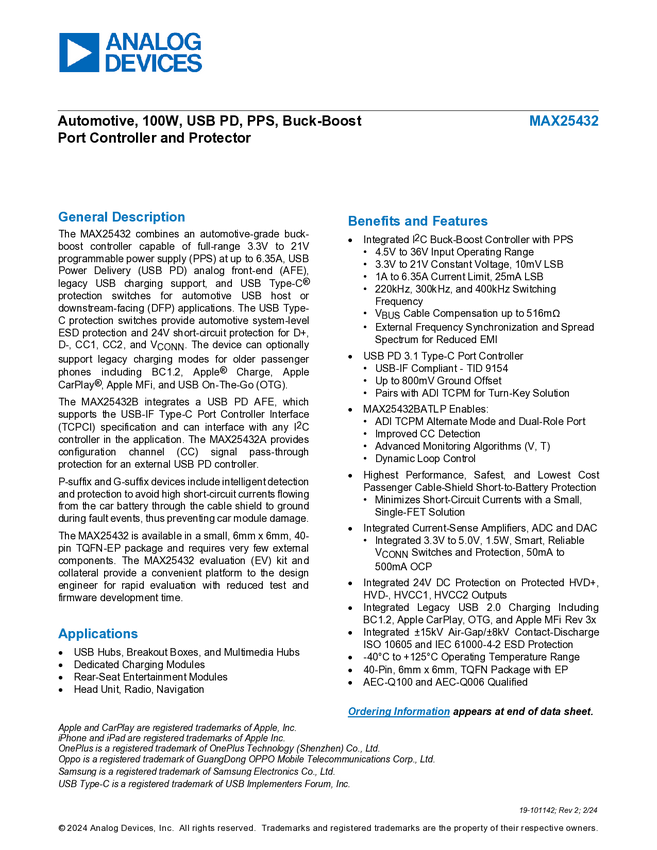 MAX25432 Automotive, 100W, USB PD, PPS, Buck-Boost Port Controller and Protector