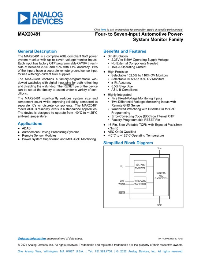 MAX20481 Four- to Seven-Input Automotive Power-System Monitor Family