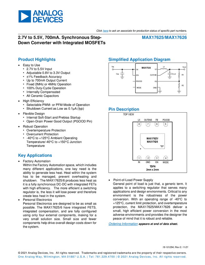 MAX17625 2.7V to 5.5V, 700mA, Synchronous Step-Down Converter with Integrated MOSFET...