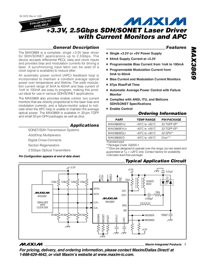 MAX3869 +3.3V, 2.5Gbps SDH/SONET Laser Driver with Current Monitors and APC