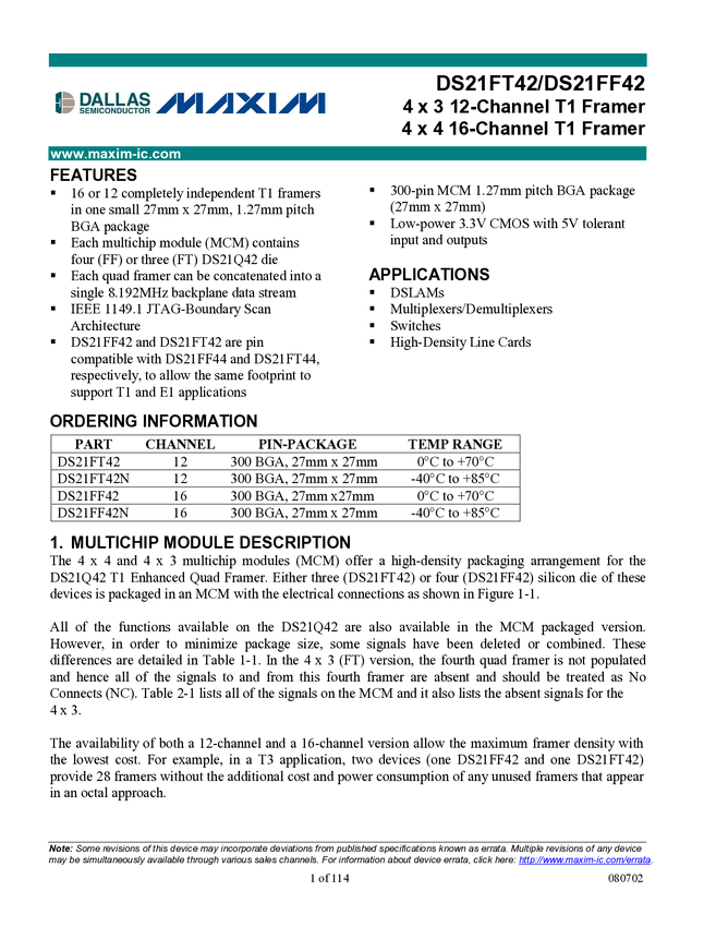 DS21FF42 4 x 4 16 Channel T1 Framer / 4 x 3 12 Channel T1 Framer