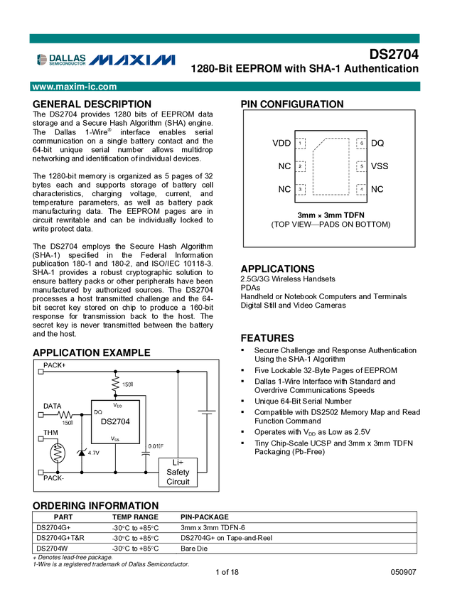 DS2704 1280-Bit EEPROM with SHA-1 Authentication